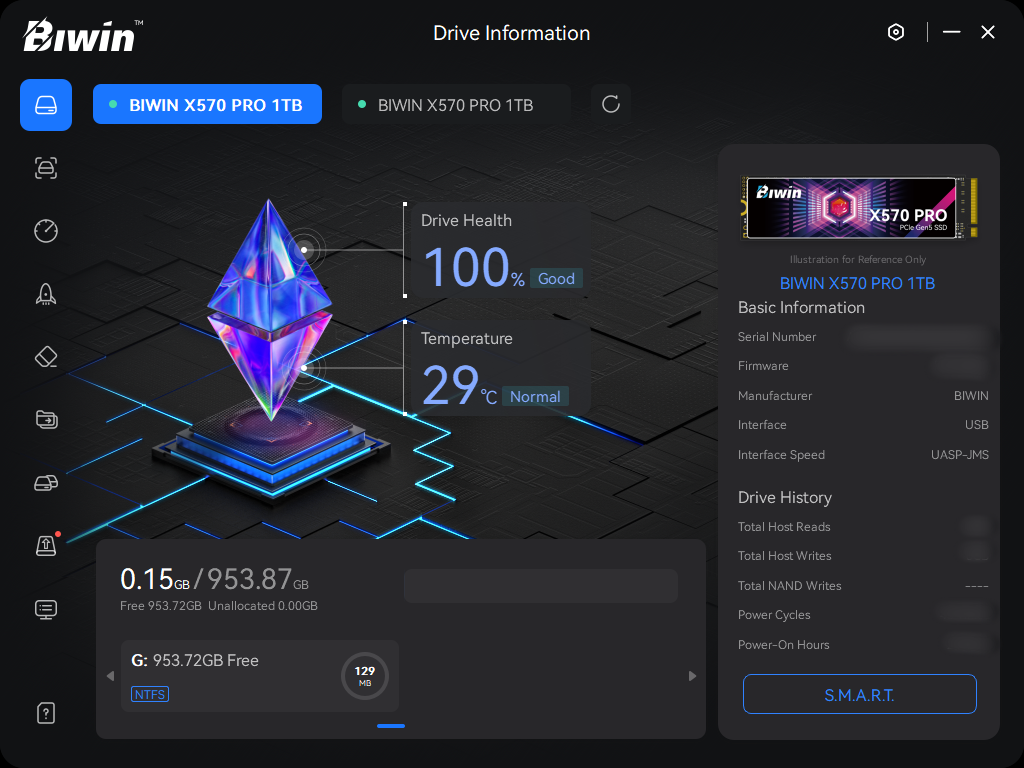 Biwin Intelligence ist eine multifunktionale Verwaltungssoftware, die dazu entwickelt wurde, Biwin-Speicherprodukte d zu unterstützen. Für ein bequemeres und sichereres Speichererlebnis hilft diese Software den NutzernAnwendern, ihre Produkte zu verwalten, mit Funktionen wie Leistungstests, Datenmigration, Firmware-Updates und mehr. Biwin Intelligence unterstützt Windows und bietet sowohl helle als auch dunkle Themen und mehrere Sprachoptionen.