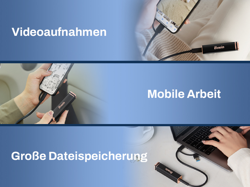 Die Biwin PD2000 ermöglicht eine direkte Verbindung zu Smartphones über USB-C und integriert nahtlos alle Aspekte Ihres mobilen und digitalen Lebens – einschließlich Familienerinnerungen, Vlog-Erstellung*, mobiler Arbeit und großer Dateien. Dank ihres Plug-and-Play-Designs bietet sie einfachen und bequemen Zugriff auf Ihre Daten jederzeit und überall, um Ihr digitales Erlebnis zu verbessern.