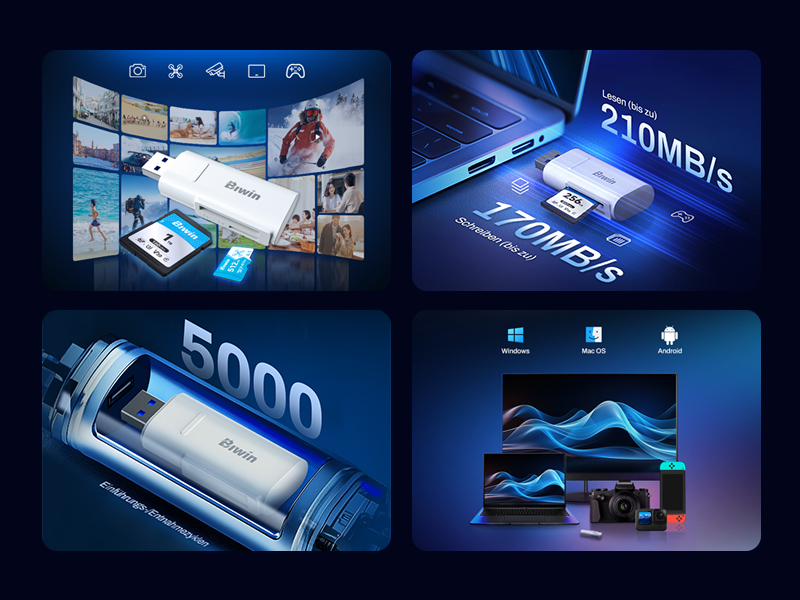 Biwin RC210 bietet echte Plug-and-Play-Funktionalität mit Hot-Swapping-Unterstützung, ohne Treiberinstallation. Es ist mit verschiedenen Systemen und Geräten kompatibel, vereinfacht die Dateiübertragung und ermöglicht eine mühelose Datenverwaltung, insbesondere für diejenigen, die schnellen Zugriff auf mehrere Karten benötigen.