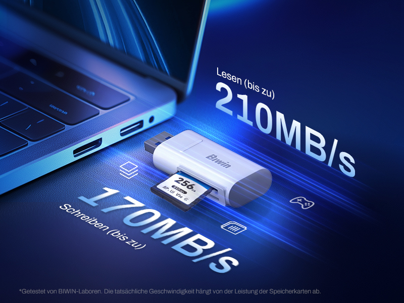 Das Biwin RC210, eines der schnellsten UHS-I-Kartenlesegeräte, bietet Hochgeschwindigkeitsdatenübertragung mit sequentiellen Lese- und Schreibgeschwindigkeiten von bis zu 210 MB/s bzw. 170 MB/s. Durch die Nutzung des USB 3.2-Protokolls bietet es Übertragungsraten von bis zu 5 Gbit/s und gewährleistet so schnelle und zuverlässige Leistung. Genießen Sie ein nahtloses Erlebnis mit Geschwindigkeiten, die jedem professionellen oder privaten Projekt gerecht werden.