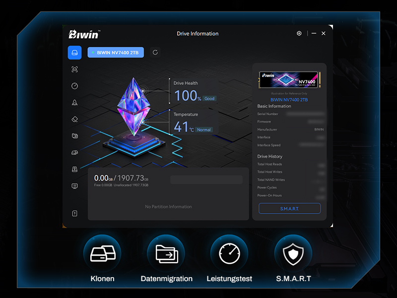 Biwin Intelligence ist eine multifunktionale Verwaltungssoftware, die zur Unterstützung der Speicherprodukte der Verbrauchermarke Biwin entwickelt wurde. Für eine bequemere und sicherere Speichernutzung hilft diese Software den Benutzern bei der Verwaltung ihrer Laufwerke mit Funktionen wie Leistungstests, Datenmigration, Firmware-Updates und vielem mehr.