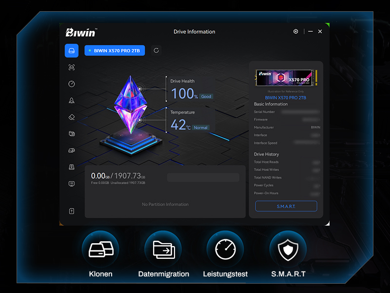 Biwin Intelligence ist eine multifunktionale Verwaltungssoftware, die zur Unterstützung der Speicherprodukte der Verbrauchermarke Biwin entwickelt wurde. Für eine bequemere und sicherere Speichernutzung hilft diese Software den Benutzern bei der Verwaltung ihrer Laufwerke mit Funktionen wie Leistungstests, Datenmigration, Firmware-Updates und vielem mehr.