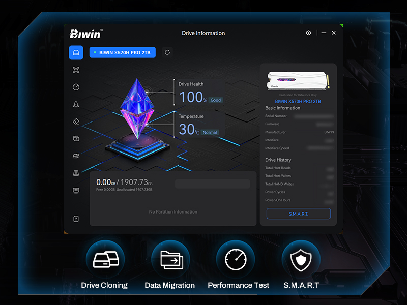 Biwin Intelligence ist eine multifunktionale Verwaltungssoftware zur Unterstützung von Speicherprodukten der Marke Biwin. Für ein komfortableres und sichereres Speichererlebnis unterstützt diese Software Benutzer bei der Verwaltung ihrer Laufwerke mit Funktionen wie Leistungstests, Datenmigration, Firmware-Updates und mehr.